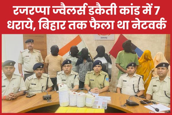 Ramgarh (Dharmendra Pradhan) : रजरप्पा थाना क्षेत्र के चितरपुर रजरप्पा मोड़ स्थित शिव शंकर ज्वैलर्स में हुई डकैती की बड़ी घटना का पुलिस ने खुलासा कर दिया है। इस मामले में पुलिस ने 7 अपराधियों को गिरफ्तार किया है। इनके पास से लूटे गए सोने-चांदी के गहने, हथियार, बाइक, स्कूटी, कार और कई अन्य सामान बरामद किए गए हैं। यह वारदात बीते 21 अप्रैल को दिनदहाड़े हुई थी। दोपहर करीब 3:40 बजे अपराधियों ने शिव शंकर ज्वैलर्स दुकान में घुसकर डकैती की थी। घटना के बाद इलाके में हड़कंप मच गया था।