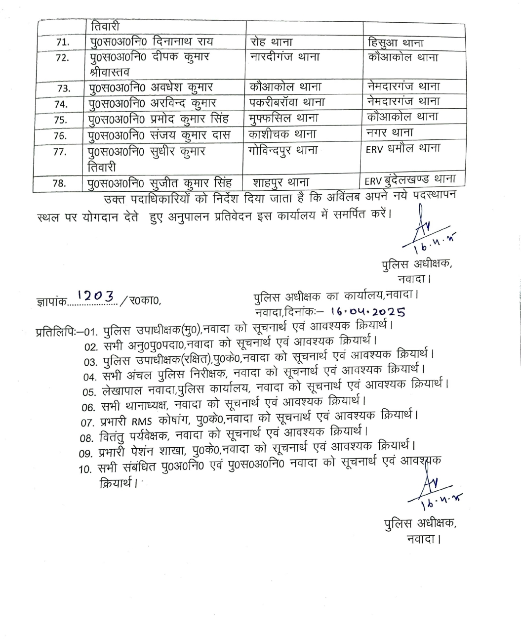 Nawada : बिहार के नवादा में 78 पुलिस अधिकारियों को इधर से उधर किया गया है। लंबे समय से एक ही थाने में तैनात सब इंस्पेक्टर (SI) और असिस्टेंट सब इंस्पेक्टर (ASI) रैंक के अधिकारियों का तबादला किया गया है। संबंधित सूचना नवादा पुलिस कप्तान अभिनव धीमान के आदेश से जारी कर दी गयी है। एसपी अभिनव धीमान ने कहा कि एक ही स्थान पर लंबे समय तक तैनाती से कई बार कार्यशैली में शिथिलता आ जाती है, जिससे कानून व्यवस्था पर प्रतिकूल असर पड़ता है। ऐसे में यह तबादला जरूरी था। ट्रांसफर किये गये सभी पुलिस अधिकारियों को तत्काल योगदान देने का निर्देश दिया गया है। कौन से अधिकारी का कहां हुआ तबादला… देखें लिस्ट