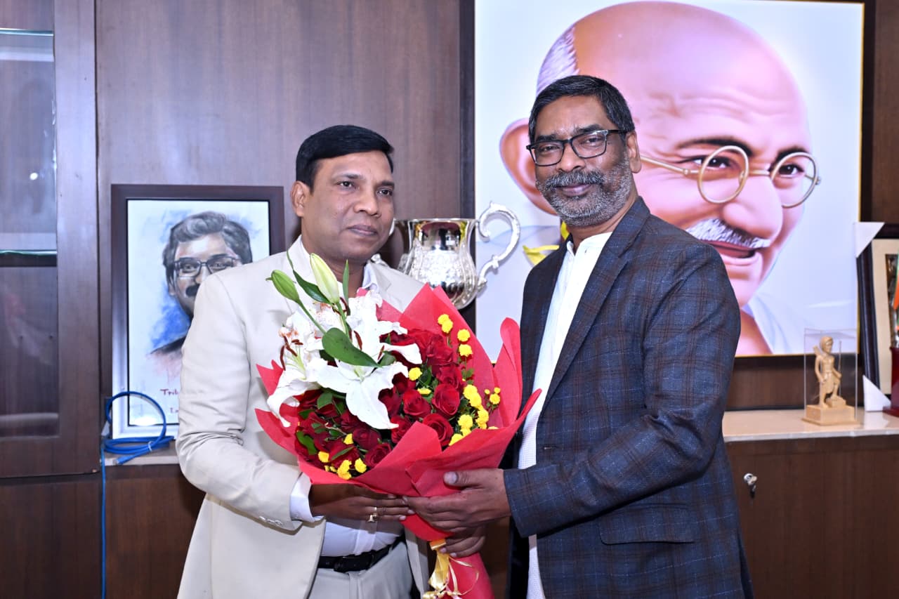 सीएम हेमंत सोरेन का स्वागत करते विधानसभा के प्रभारी सचिव रंजीत कुमार