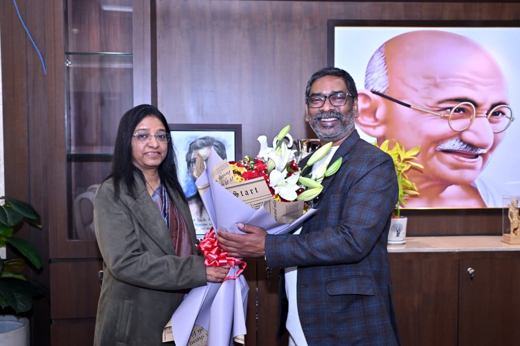 सीएम हेमंत सोरेन का स्वागत करते मंत्रिमंडल सचिवालय और समन्वय विभाग की प्रधान सचिव वंदना दादेल