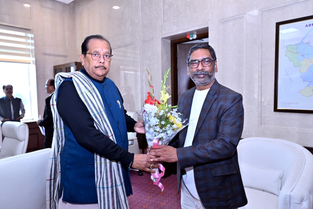 सीएम हेमंत सोरेन का स्वागत करते संसदीय कार्य मंत्री राधा कृष्ण किशोर