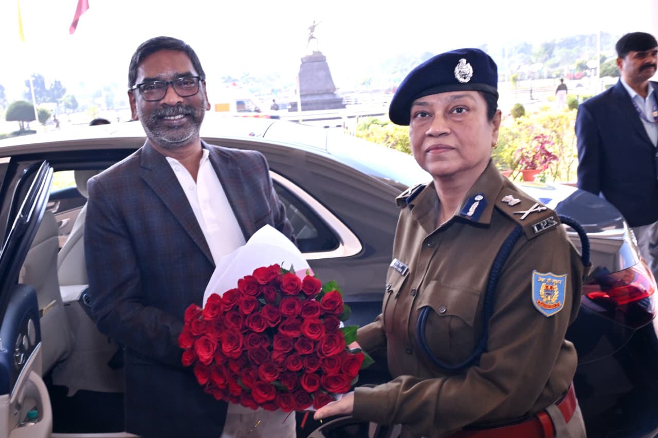 सीएम हेमंत सोरेन का स्वागत करते डीजीपी तदाशा मिश्रा