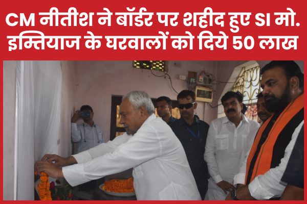 Patna : जम्मू के आरएस पुरा सेक्टर में क्रॉस बॉर्डर फायरिंग में शहीद हुए बीएसएफ के सब इंस्पेक्टर मोहम्मद इम्तियाज को सोमवार देर शाम सुपुर्द-ए-खाक किया गया। आज बिहार के CM नीतीश कुमार शहीद के घर पहुंचे और श्रद्धांजलि अर्पित करने के बाद परिजनों से मुलाकात की। CM ने शहीद के परिवार को कुल 50 लाख रुपये की सहायता राशि का चेक सौंपा, जिसमें 21 लाख रुपये बिहार सरकार की ओर से तथा 29 लाख रुपये मुख्यमंत्री राहत कोष से प्रदान किए गए।