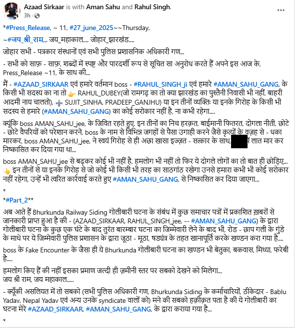 वायरल हुए इस पोस्ट में आगे जिक्र है कि भुरकुंडा रेलवे साइडिंग पर गोलीबारी की घटना के कुछ घंटे बाद ही अमन साहू गैंग के आजाद सरकार और राहुल सिंह ने ली थी। पोस्ट में लिखा है कि “भुरकुंडा रेलवे साइडिंग में गेलीबारी की घटना की जिम्मेदारी बार-बार आजाद सरकार और राहुल सिंह ने ली, बावजूद इसके रोड छाप गली के टुच्चे गुंडों के माथे पर झूठी जिम्मेदारी डाल पुलिस-प्रशासन खानापूर्ति कर हमारी जिम्मेदारी लेने की बात की खंडन कर दिया। बॉस के फेक एनकाउंटर के जैसा ही भुरकुंडा गोलीबारी की घटना का खंडन भी बेतुका और झूठा है। हमलोग किये हैं कि नहीं, इसका प्रमाण जल्द ही जमीनी स्तर पर सबको देखने को मिलेगा।”