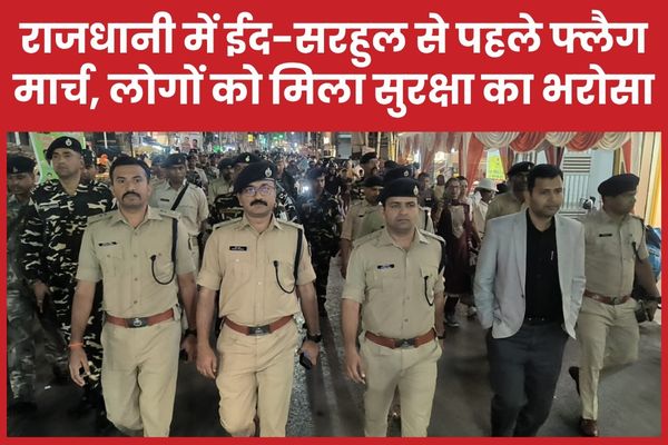 Ranchi : ईद और सरहुल पर्व को देखते हुए राजधानी रांची में पुलिस पूरी तरह सतर्क नजर आ रही है। शुक्रवार को मेन रोड पर पुलिस ने फ्लैग मार्च निकालकर साफ संकेत दिया कि त्योहार के दौरान किसी तरह की गड़बड़ी बर्दाश्त नहीं की जाएगी।