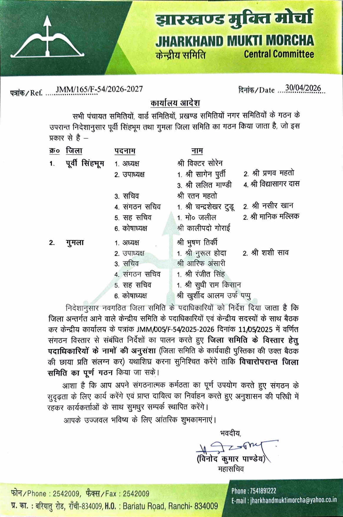Ranchi : झामुमो ने संगठन को जमीनी स्तर पर और मजबूत करने के लिए जमशेदपुर और गुमला जिले में नई जिला समितियों का गठन कर दिया गया है। झामुमो के महासचिव विनोद कुमार पांडेय की ओर से जारी आदेश में दोनों जिलों के पदाधिकारियों के नाम घोषित किए गए हैं। साथ ही साफ कहा गया है कि अब अगला कदम संगठन का विस्तार है, जिसे जल्द पूरा करना होगा।