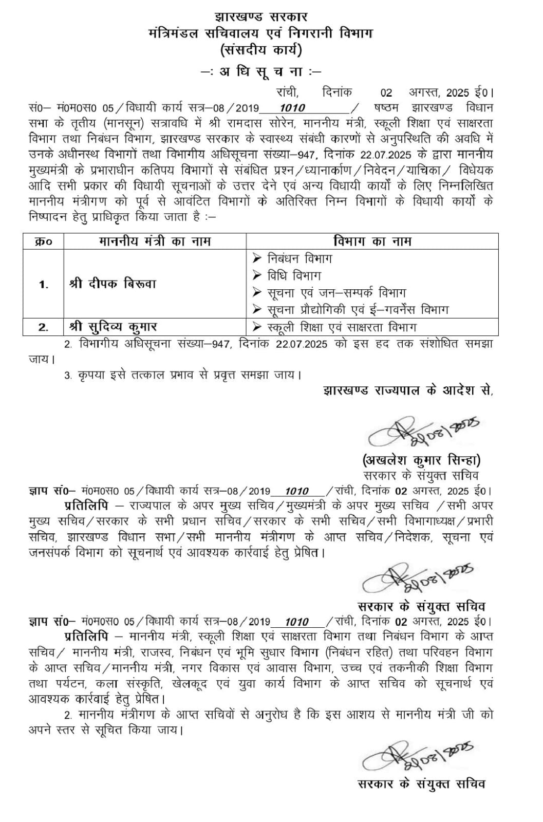 Ranchi : झारखंड सरकार ने मंत्री रामदास सोरेन की खराब तबीयत के चलते विधानसभा के मानसून सत्र के दौरान विभागीय जिम्मेदारियों में बदलाव किया है। शनिवार को मंत्रिमंडल सचिवालय एवं निगरानी विभाग ने इस संबंध में अधिसूचना जारी की। नए प्रभार के तहत, नगर विकास, आवास एवं उच्च शिक्षा मंत्री सुदिव्य कुमार सोनू अब स्कूली शिक्षा विभाग से जुड़े सवालों का जवाब देंगे। वहीं, दीपक बिरुआ को निबंधन, विधि, सूचना एवं जनसंपर्क और सूचना प्रौद्योगिकी विभाग से जुड़े प्रश्नों का उत्तर देने की जिम्मेदारी दी गई है।