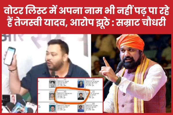सम्राट चौधरी ने कहा, “जब तेजस्वी यादव अपना नाम मतदाता सूची में पढ़कर नहीं खोज सकते तो उनकी योग्यता पर सवाल उठना स्वाभाविक है। उनका नाम ससम्मान उनके पिता के साथ दर्ज है। अब तो झूठ और भ्रम फैलाना बंद कीजिए।” उन्होंने आगे कहा कि तेजस्वी यादव का बयान न केवल तथ्यहीन है, बल्कि यह निर्वाचन प्रक्रिया की निष्पक्षता पर भी सवाल उठाने की सोची-समझी साजिश है।