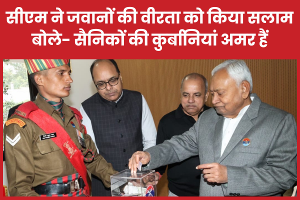 इस अवसर पर सीएम ने बिहार स्टेट एक्स सर्विसमैन बेनेवोलेंट फंड में अपना अंशदान देकर पूर्व सैनिकों और शहीद परिवारों के प्रति समर्थन जताया। उन्होंने कहा कि देश की सुरक्षा में सैनिकों की भूमिका हमेशा याद रखी जाएगी।