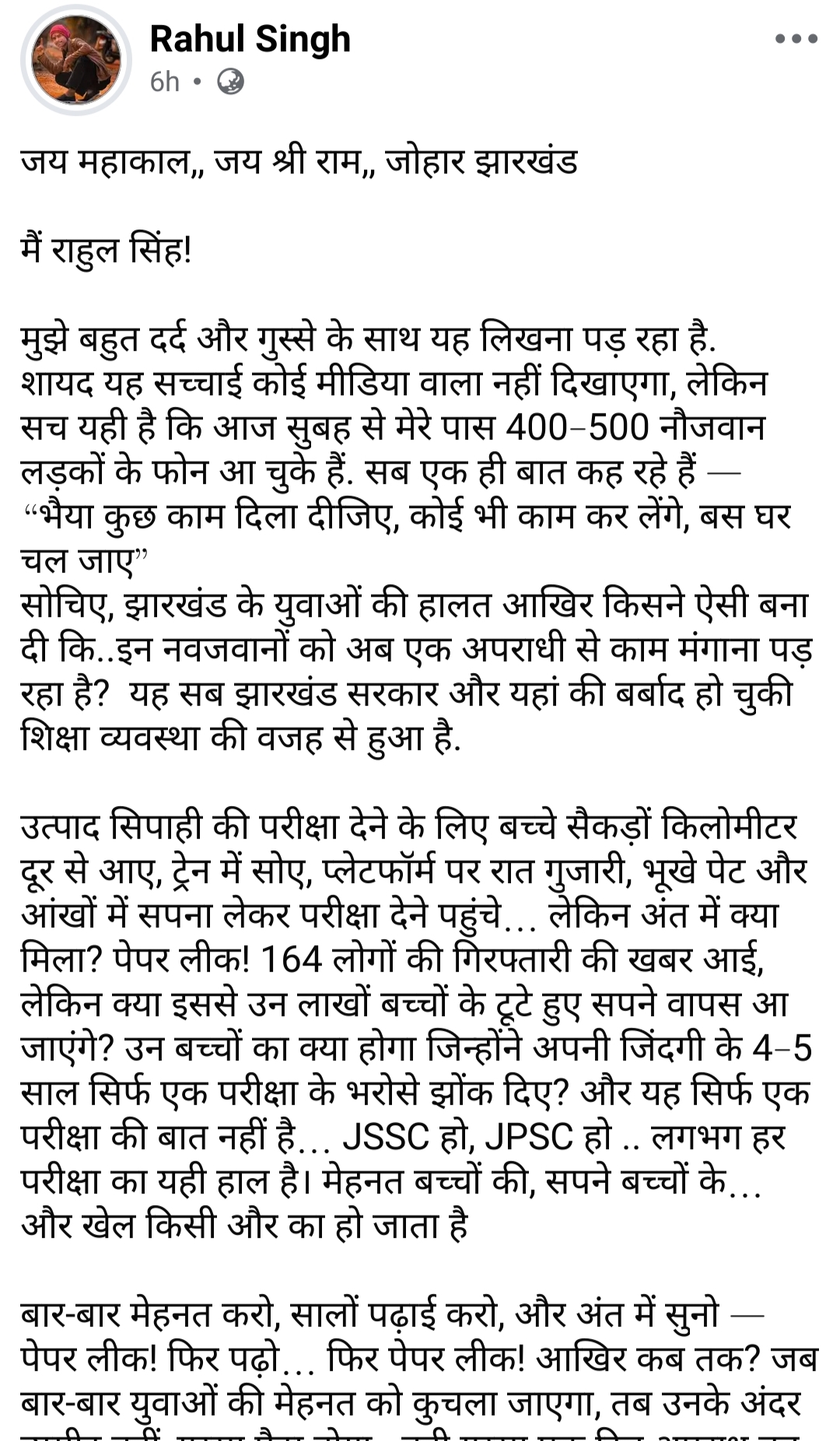 राहुल सिंह ने अपने पोस्ट में लिखा कि सिर्फ एक परीक्षा नहीं, बल्कि JSSC और JPSC जैसी परीक्षाओं में भी लगातार गड़बड़ी की खबरें आती रही हैं। उसने कहा कि मेहनत छात्र करते हैं, सपने भी उनके होते हैं, लेकिन खेल कोई और कर जाता है। इससे युवाओं के अंदर गुस्सा बढ़ता है और उनका मन टूट जाता है।