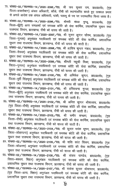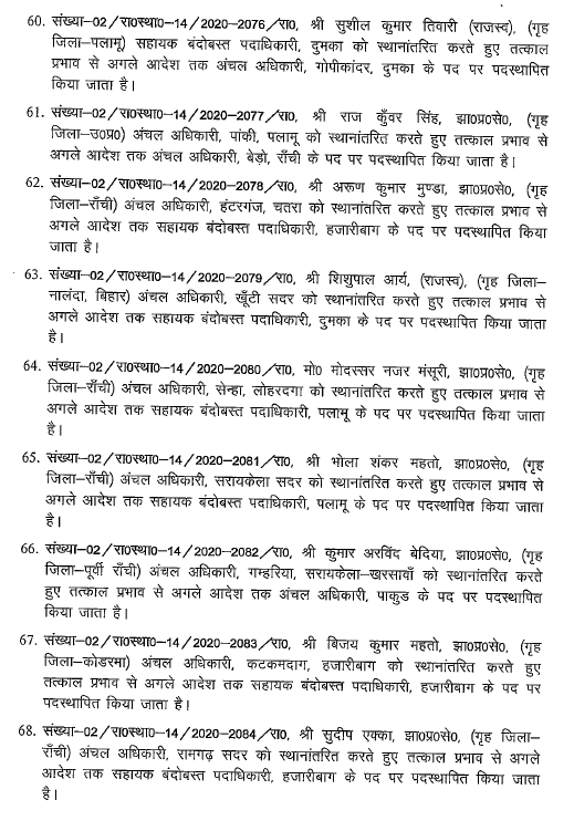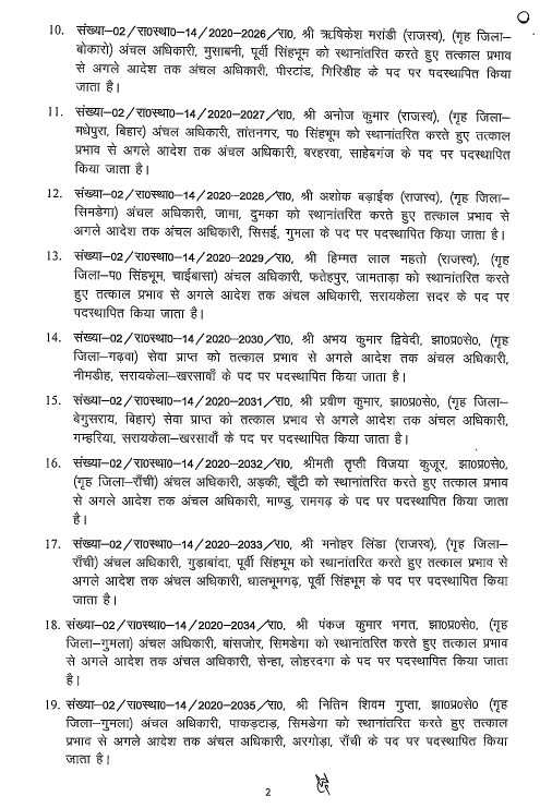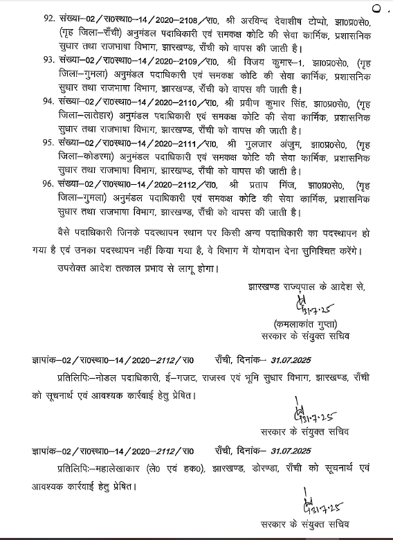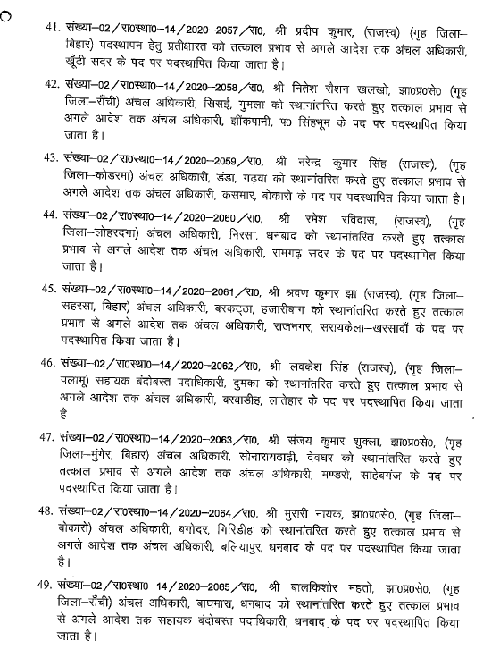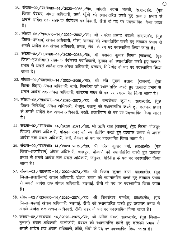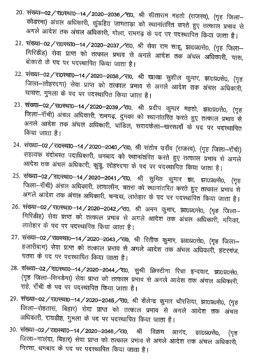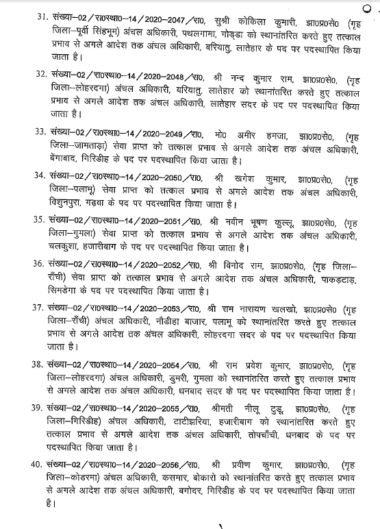 Ranchi : झारखंड में एक बार फिर बड़े पैमाने पर अधिकारियों का तबादला किया गया है। राज्य सरकार ने भू-राजस्व विभाग के 96 अधिकारियों को इधर से उधर किया गया है। इस सबंधं में गुरुवार देर शाम राजस्व, निबंधन एवं भूमि सुधार विभाग ने अधिसूचना जारी की। इस फेरबदल के तहत राजधानी रांची, धनबाद, हजारीबाग समेत कई जिलों के अधिकारी शामिल है। देखें पूरी लिस्ट…