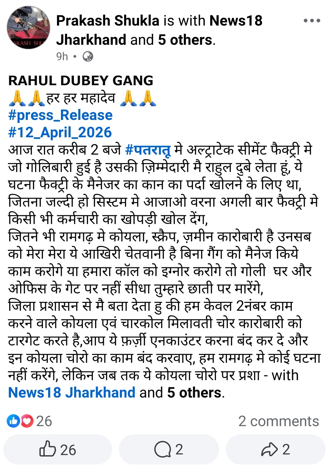पोस्ट में गैंग ने पुलिस और जिला प्रशासन पर गंभीर आरोप लगाए हैं। गैंग का दावा है कि वे केवल “दो नंबर” काम करने वालों को निशाना बनाते हैं और प्रशासन अगर कथित “फर्जी एनकाउंटर” बंद कर दे तथा कोयला चोरी का काम रुकवा दे तो वे रामगढ़ में कोई घटना नहीं करेंगे। इस बयान ने मामले को और ज्यादा संवेदनशील बना दिया है।