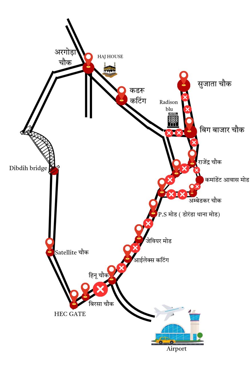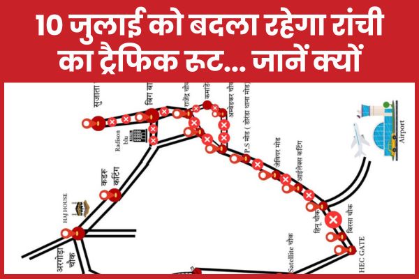 - 10.07.2025 को बिग बाजार चौक, रांची से कडरू ब्रिज के नीचे चौक तक (उक्त कार्यक्रम में भाग लेने वाले वाहनों को छोड़कर) सभी प्रकार के वाहनों का प्रवेश एवं परिचालन वर्जित रहेगा।